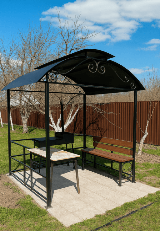 - Размер и форма: навес под мангальную зону изготавливается по индивидуальным размерам — цена зависит от масштаба и особенностей размещения.